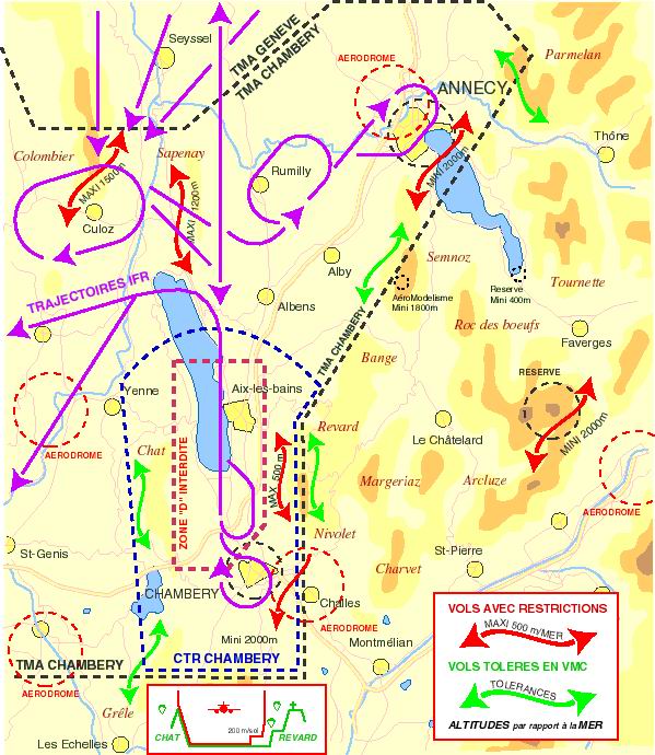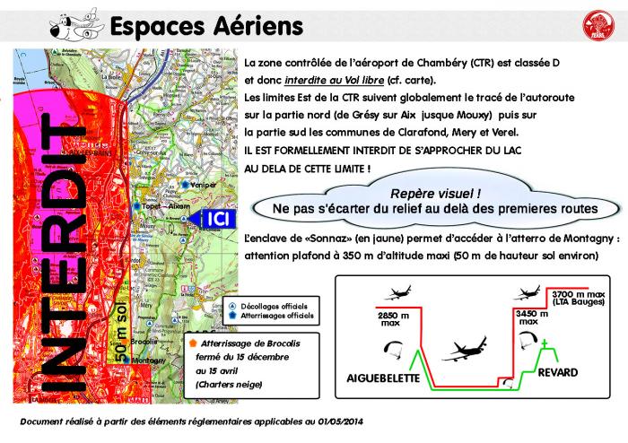La chaîne du Revard est située en bordure de la CTR de Chambéry (Classée D et donc interdite au vol libre). Les restrictions suivantes sont à respecter impérativement : Pas de vol en vallée. Ne pas dépasser la D211, notamment en approche de l’atterrissage « Aixam – Le Topet » qui se trouve en limite de la CTR. Attention avec les Charters hiver, la TMA de Chambéry est classée D du 15 décembre au 7 Avril du Vendredi 0h au lundi 11h UTC. Donc pas de vol dans la TMA de Chambéry les WE en hiver. Le plancher de la TMA est à 1000m. Les nouvelles limites Est de la TMA définies fin 2017 dégagent les crêtes du Revard